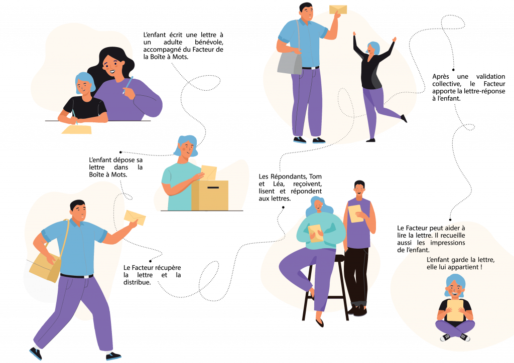 La Boîte à Mots propose un échange confidentiel entre enfants et adultes qui ne se rencontrent jamais. Elle associe le plaisir d’écrire et de lire. Cette initiative se déroule en relation étroite avec les professionnels éducatifs, professeurs des écoles, animateurs, des différents lieux qui accueillent la Boîte à Mots : écoles, centres sociaux, maisons de quartier…