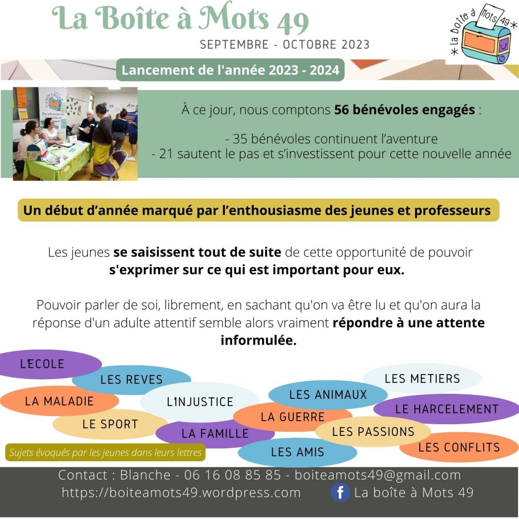 Des nouvelles de la Boîte à Mots 49 en cette rentrée 2023-2024admin22.11.2023Non classé Partagez votre amour admin Articles: 31 Article précédent Mission de Volontariat - Pour toi ? Article suivant Bonne année à la Boîte à Mots ! Mises à jour de la newsletter Saisissez votre adresse e-mail ci-dessous et abonnez-vous à notre newsletter S’inscrire Laisser un commentaireAnnuler la réponseVotre adresse e-mail ne sera pas publiée. Les champs obligatoires sont indiqués avec * Nom * E-mail * Site web Ajouter un commentaire * Enregistrer mon nom, mon e-mail et mon site dans ce navigateur pour mon prochain commentaire.Laisser un commentaire